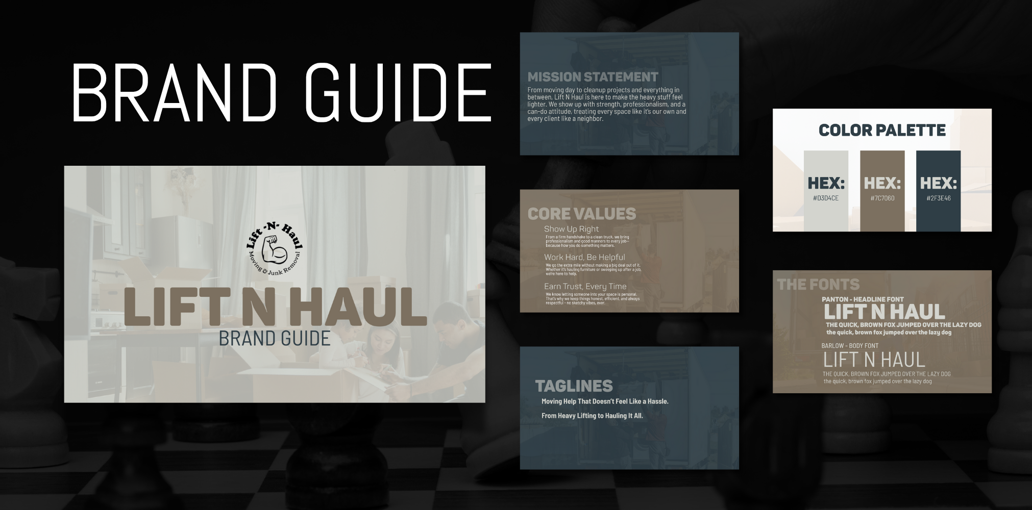 We created a custom brand guide for Lift N Haul, a local moving and junk removal company with a clear mission: to give clients confidence that their belongings are in trusted hands.